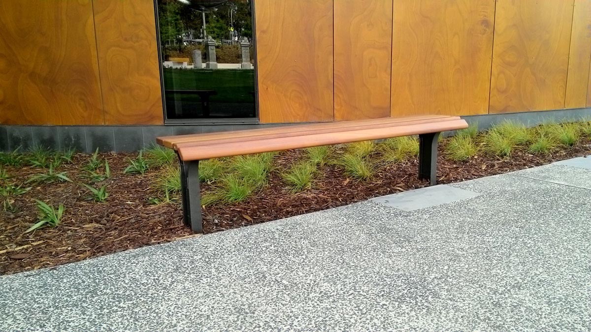 This bench is a simple, clean seat utilising natural hardwood timber planks with subtle contouring to the front of the seat.