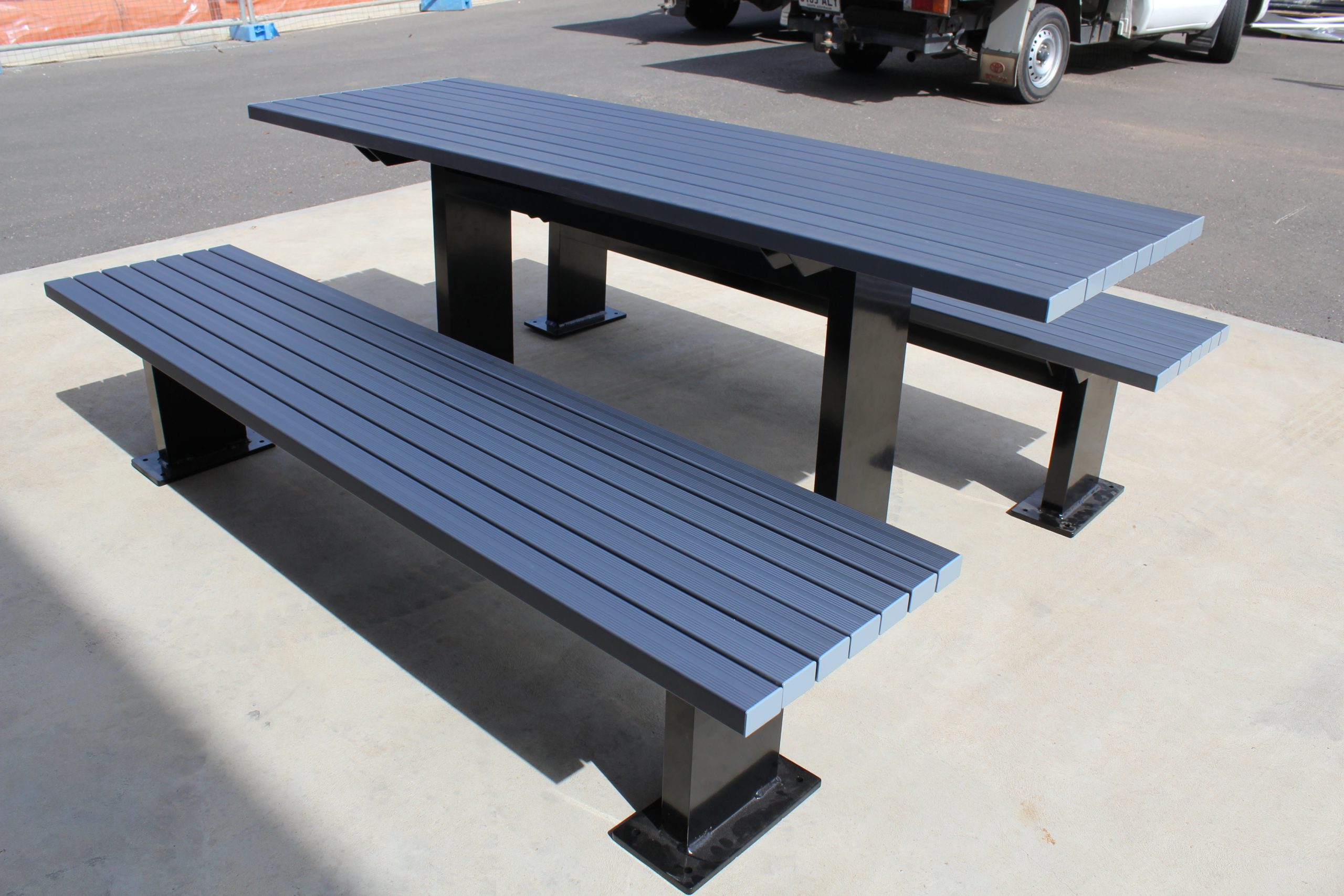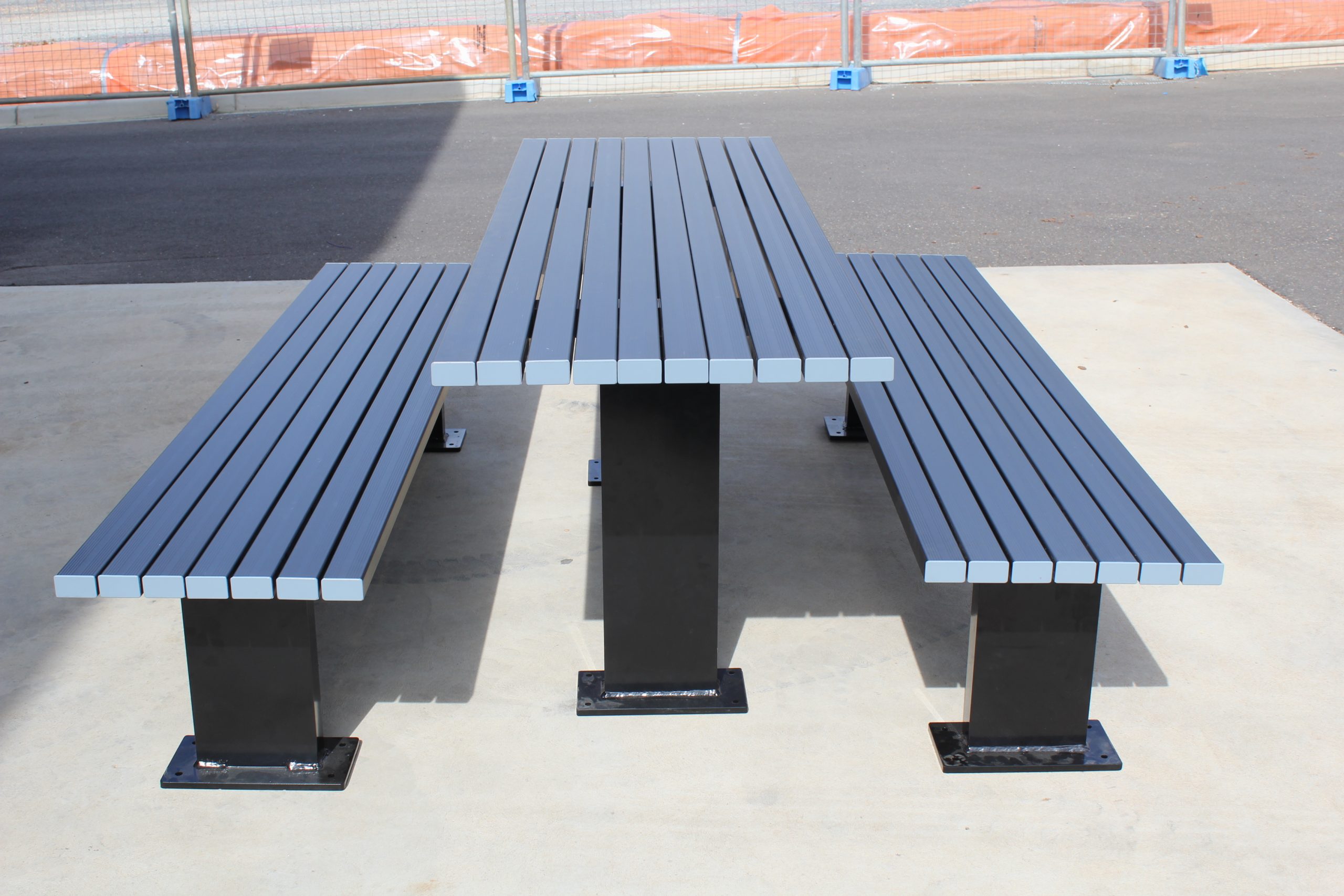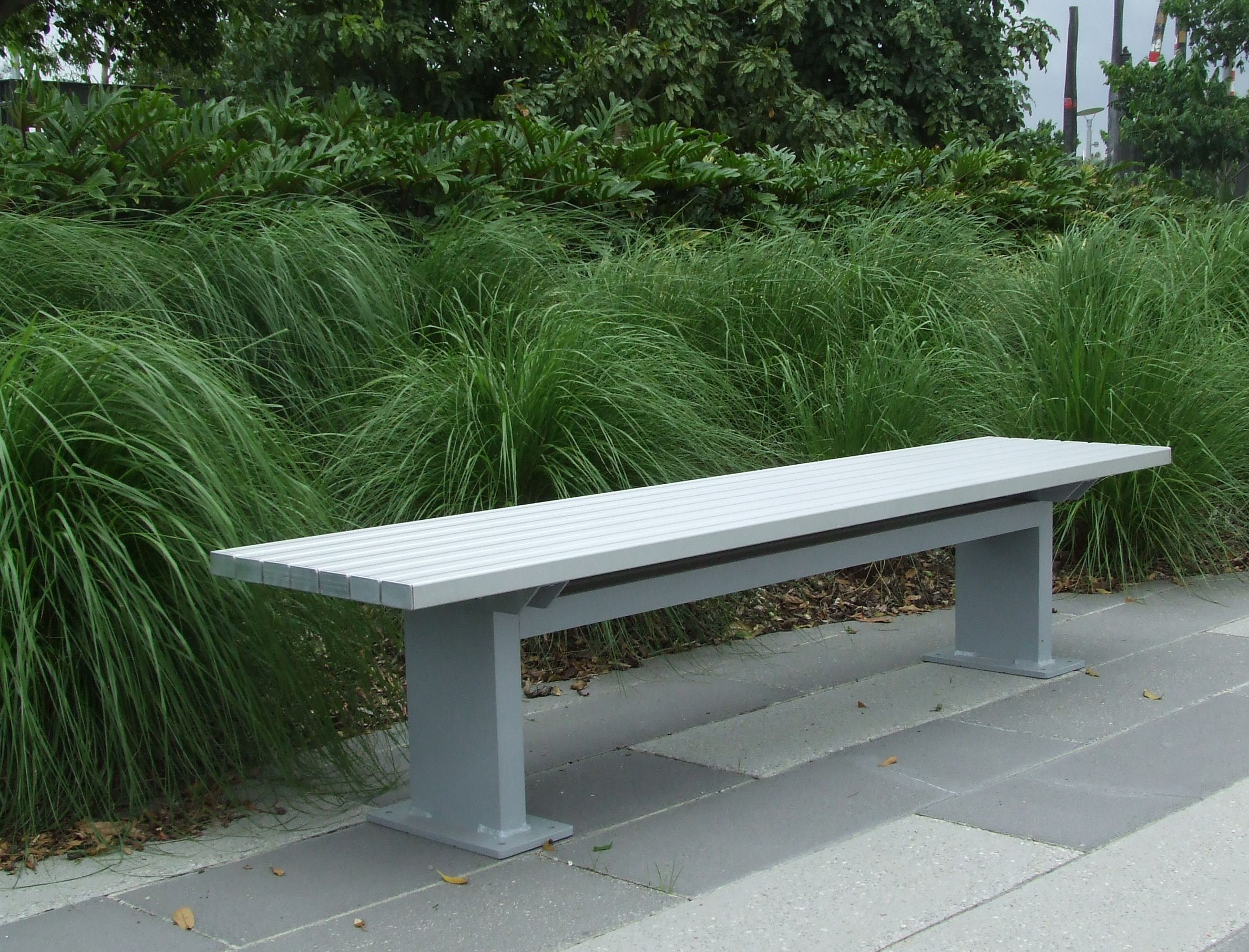 The Playford bench brings a classic geometric design aesthetic to any open area.