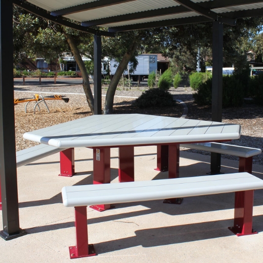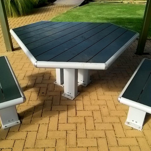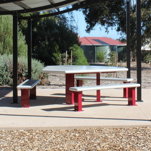 Constructed from incredibly durable, maintenance free, anodsed aluminium, it features wheelchair compliant dimensions, safe curved edges and sturdy, yet accessible leg configuration.